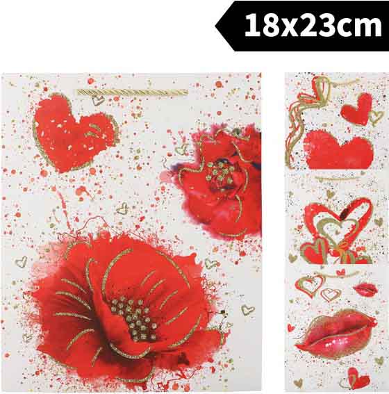 BOLSA PARA REGALO DE 23X18X10CM. DECORADA CON CORAZONES Y PURPURINA. CON ASAS DE CORDON. DE MARKET SUPREM A2194. PRECIO POR UNIDAD.