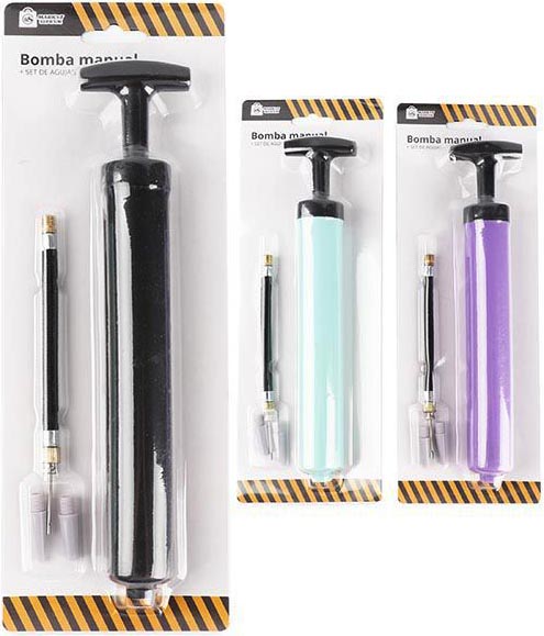 BOMBA DE INFLAR MANUAL DE 25CM. CON LATIGUILLO + BOQUILLAS SET DE AGUJAS. DE MARKET SUPREM A1451.