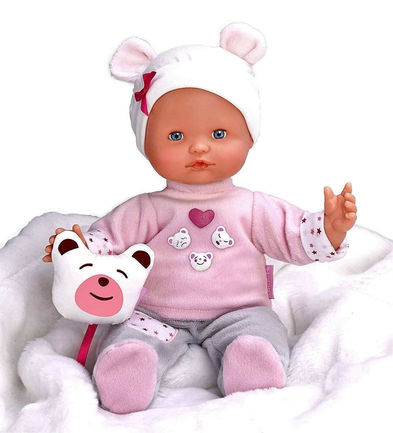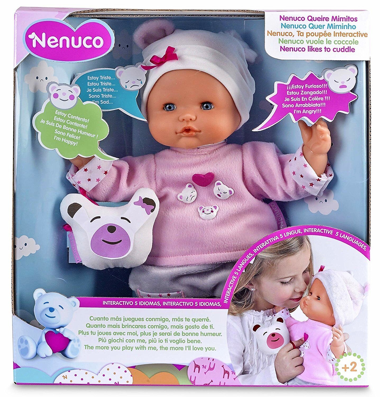 Nenuco Quiere Mimitos, un muñeco bebé de 35 cm, con el cuerpo blandito y los ojos durmientes, que viene con un osito de peluche. En el pecho, Nenuco tiene varios botones que se iluminan y emiten sonidos según se siente. Con Nenuco Quiere Mimitos tendrás que cuidar a tu bebé para ser la mejor mamá o el mejor papá. Cuanto más cuides a tu Nenuco, más contento estará. ¡Si juegas mucho con él, conseguirás que te diga que eres lo mejor del mundo! Si no le cuidas estará triste o enfadado, pero si juegas con él, será muy feliz. PRECIO POR UNIDAD.