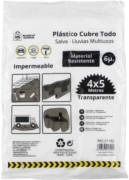 PLASTICO DE 4X5M. Y 6 MICRAS. EN BOLSA. TRANSPARENTE PARA CUBRE TODO, SALVA LLUVIA. DE MARKET SUPREM 01792.